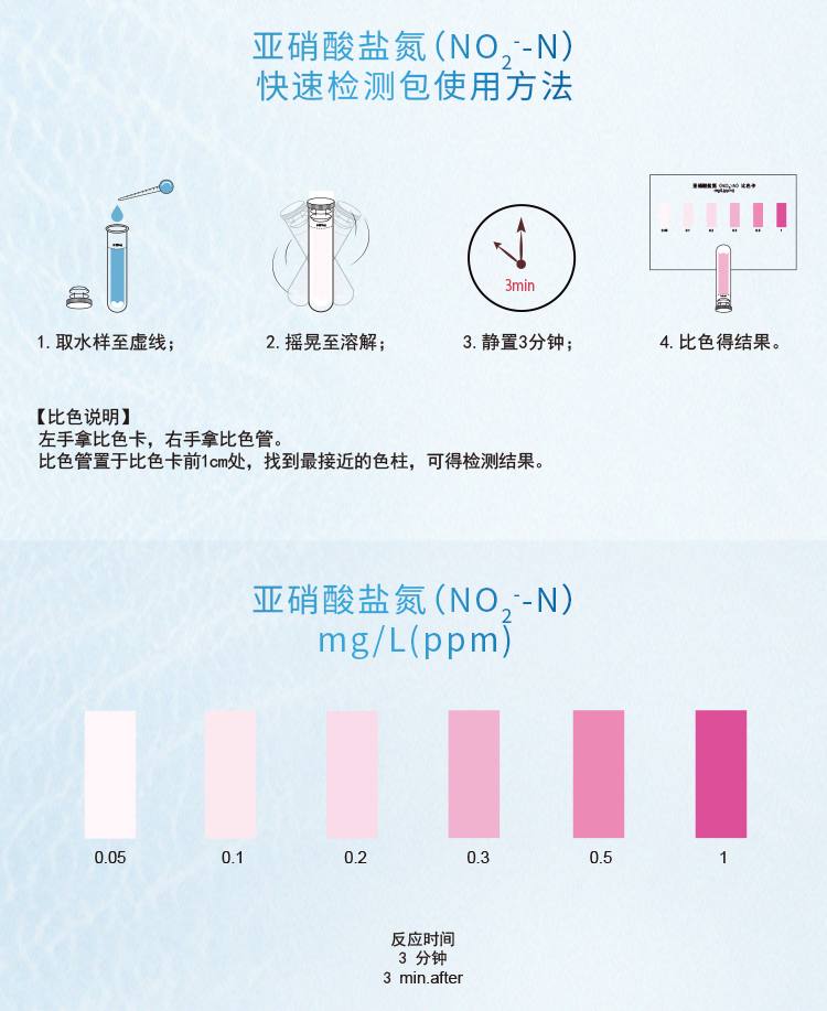 2.本產(chǎn)品檢測(cè)水中亞硝酸鹽氮(NO2- -N)含量在0.05-1mg/L(ppm)范圍內(nèi),若要檢測(cè)0.5mg/L以上濃度水樣,請(qǐng)預(yù)先稀釋水樣后再進(jìn)行測(cè)定,具體操作見(jiàn)稀釋說(shuō)明書。