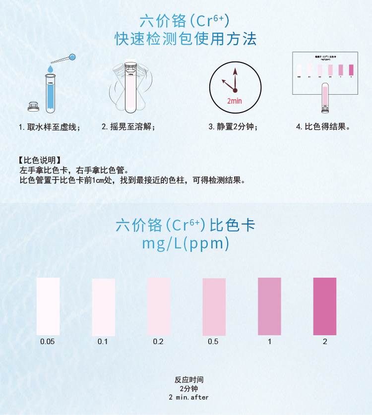 2.本產(chǎn)品檢測(cè)水中六價(jià)鉻(Cr)含量在0.05-2mg/L(ppm)范圍內(nèi),若要檢測(cè)2mg/L以上濃度水樣,請(qǐng)預(yù)先稀釋水樣后再進(jìn)行測(cè)定,具體操作見(jiàn)稀釋說(shuō)明書(shū)。